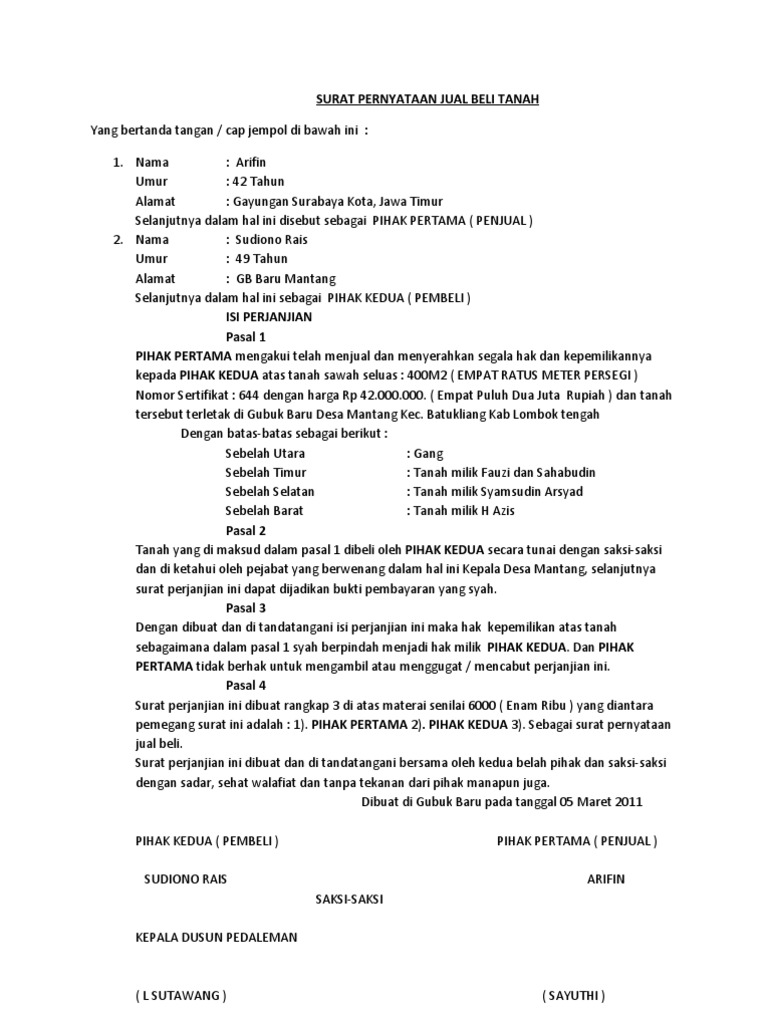 Sertifikat tanah adalah komponen yang paling penting dalam transaksi jual beli tanah. This image is provided only for personal use. Adapaun contoh dari surat jual beli tanah dapat dilihat sebagai berikut tanah warisan juga sering dijual oleh para ahli warisnya. Sebelum membuat surat kuasa, tentukan terlebih dahulu ahli. Diatas adalah contoh dari surat jual beli tanah yang baik dan benar yang bisa anda tiru atau contoh sebagai acuan dalam membuat surat tersebut. Jika nama orang yang tertera di sertifikat tanah anda masih hidup. Selain itu pengurusan jual beli juga dapat diwakilkan oleh salah satu ahli waris yang sudah mendapat maka dari itu surat kuasa tanah warisan harus mencantumkan identitas dan informasi lengkap mengenai ahli waris yang bersangkutan. Surat pernyataan penyerahan tanah merupakan bukti dokumen bahwa seseorang telah menyerahkan tanah yang dimilikinya kepada pihak lain baik itu melalui jual beli, hibah ataupun lainnya. 123, medan dengan harga rp. Dalam proses jual beli tanah warisan, diperlukan surat kuasa sebagai pembuktian kepemilikan sah atas tanah yang diwariskan kepada ahli waris. Surat jual beli tanah merupakan surat yang sengaja dibuat oleh penjual dan juga pembeli dalam menjelaskan hak dan kewajiban. Beberapa download contoh surat jual beli tanah. Ditambah lagi tidak banyak sumber contoh surat jual beli tanah yang ada baik di internet maupun yang dapat dibeli.